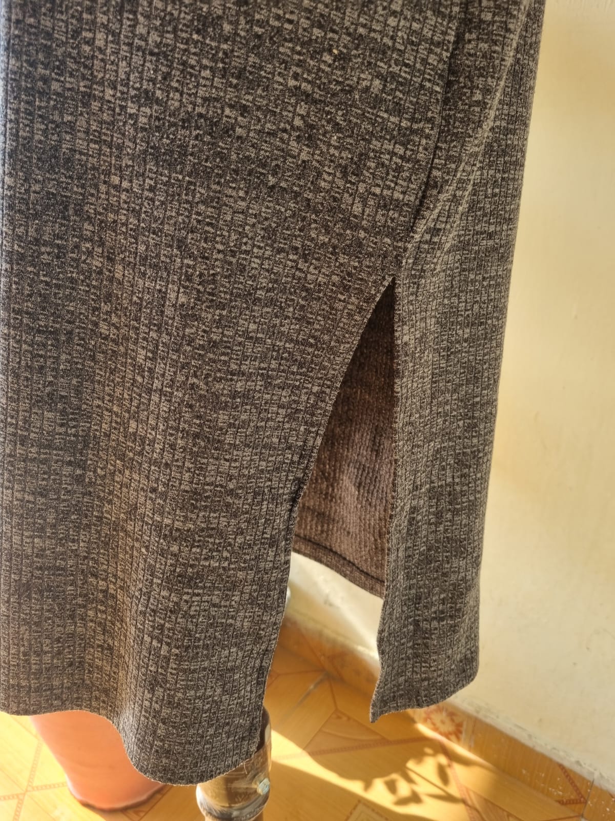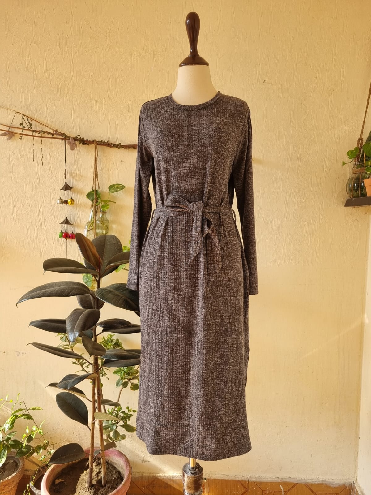 Cozy and stylish, this F&F tie waist midi dress features a side cut and loose-fit long sleeves. Made from warm knitted material, it fits UK size 16 with chest 23–24 and length 48. Perfect for staying comfortable and fashionable in colder weather. Price 2200/-