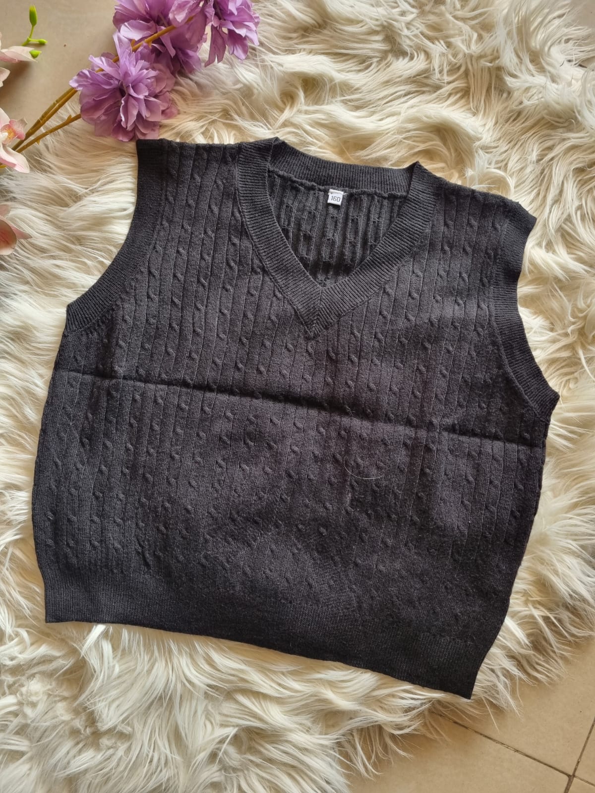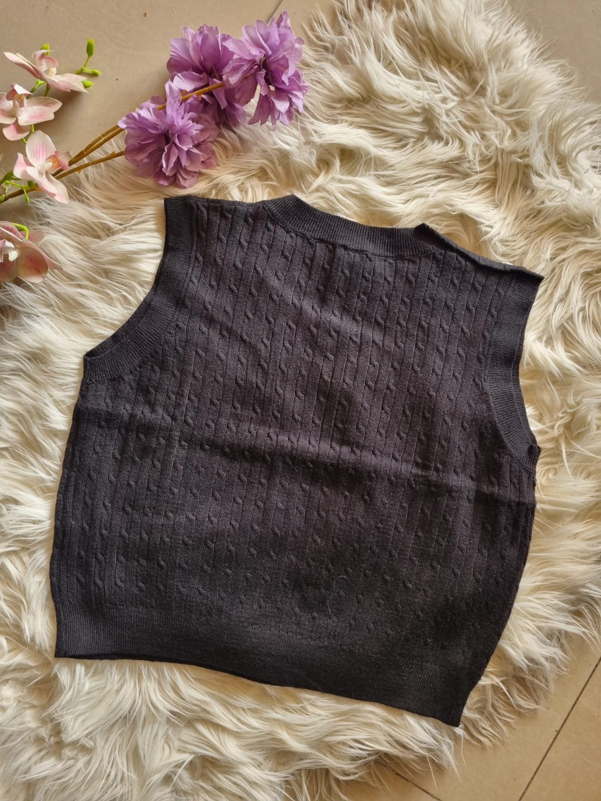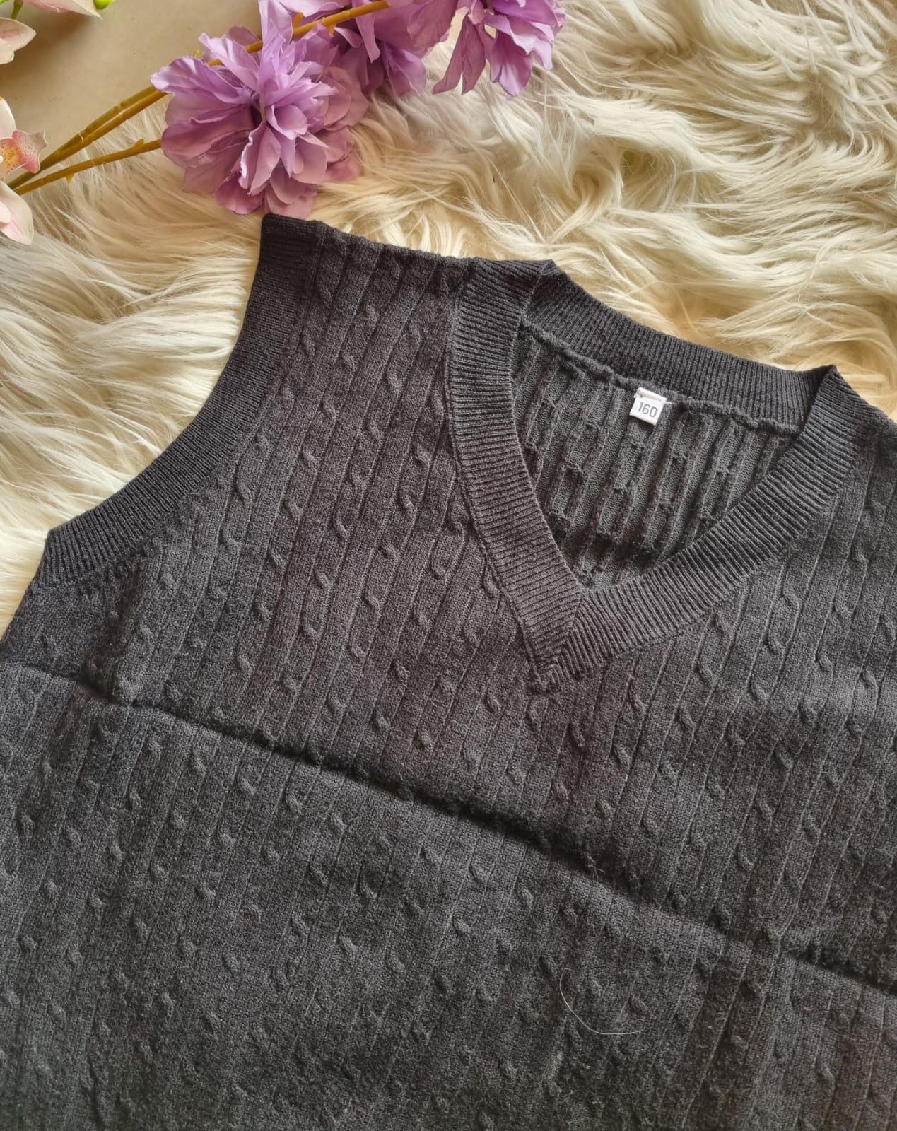 Classic and versatile, this jet black sleeveless knit vest fits small to medium sizes. In excellent condition, it’s perfect for layering over shirts or dresses for a stylish, effortless look. Price: 650/-